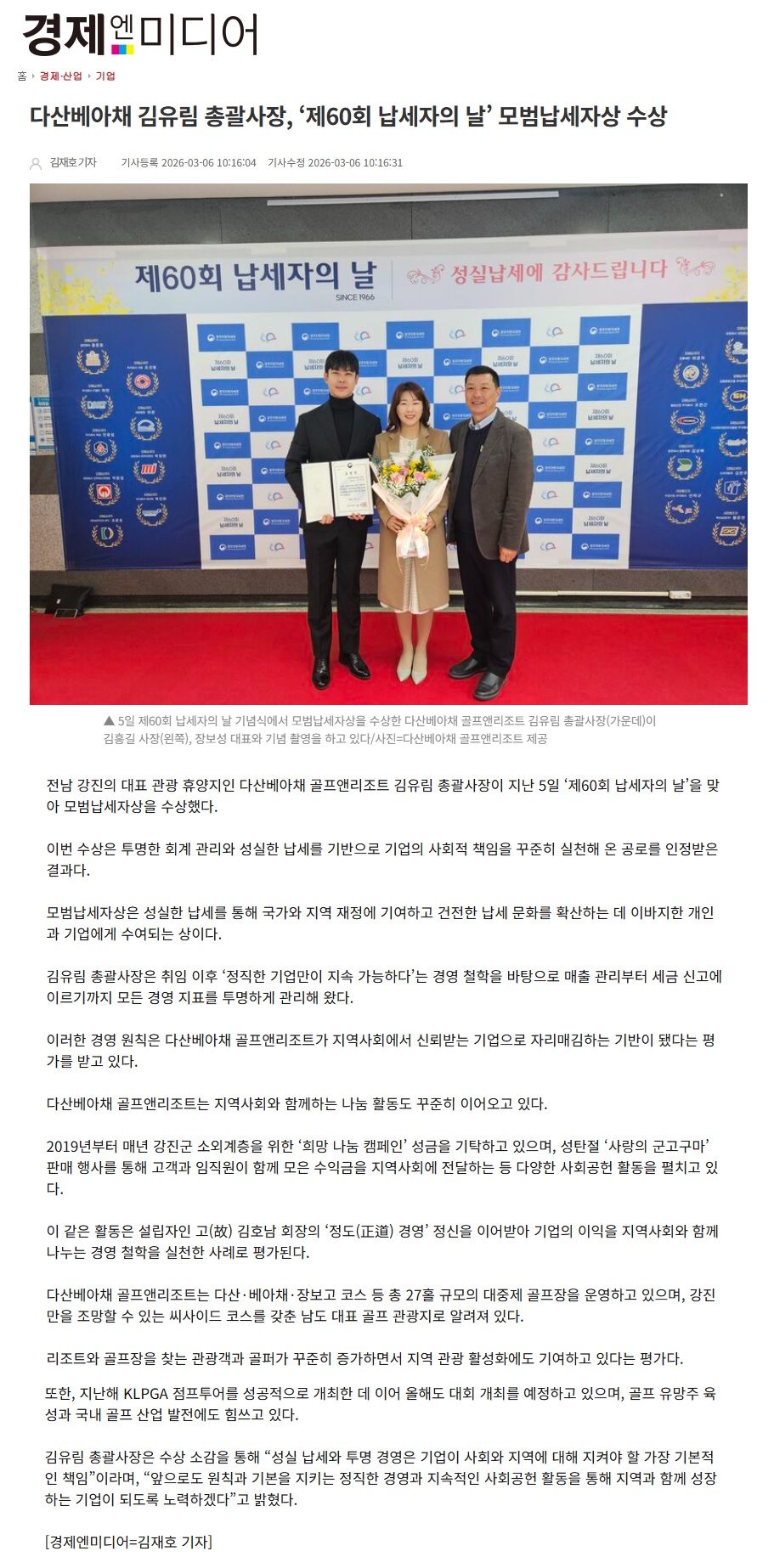 다산베아채 김유림 총괄사장, '제60회 납세자의 날' 모범납세자상 수상