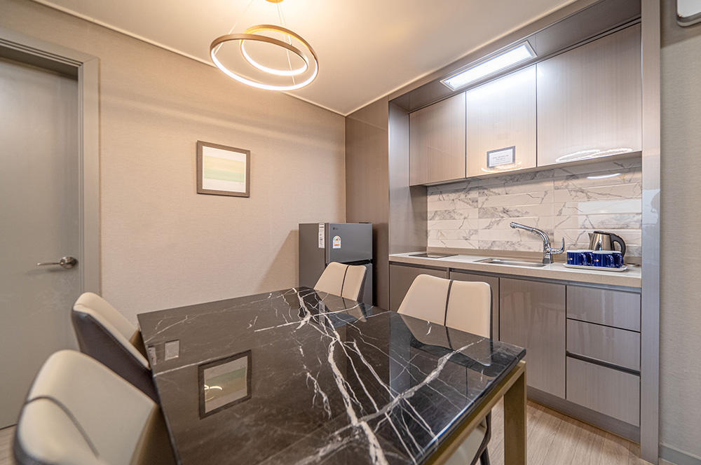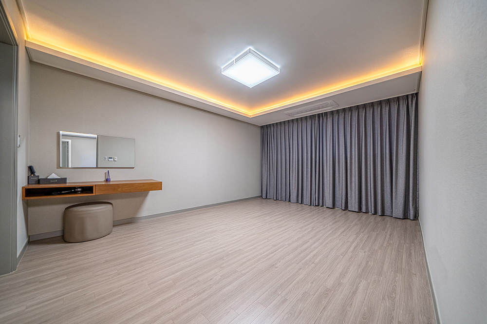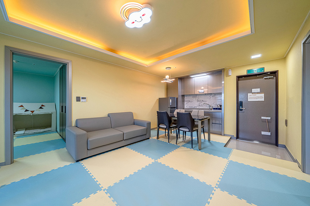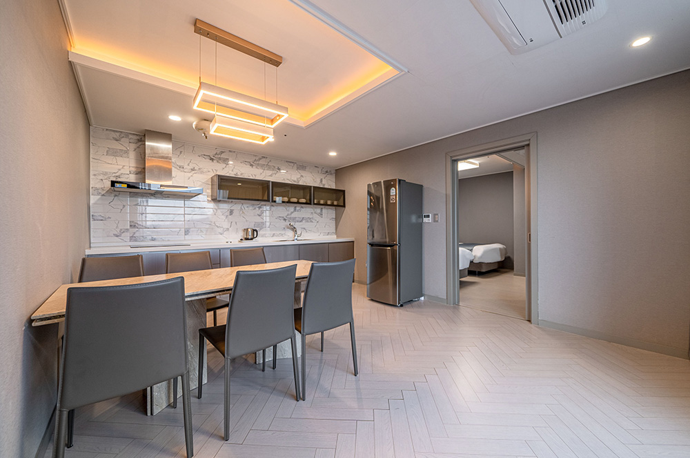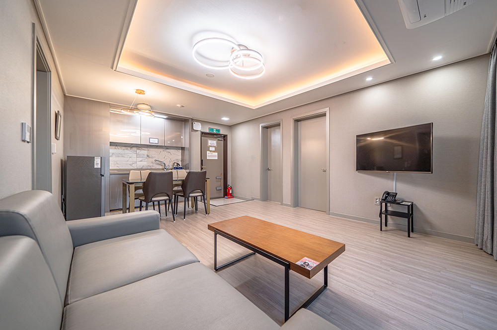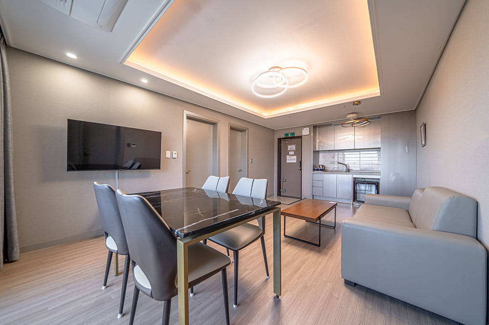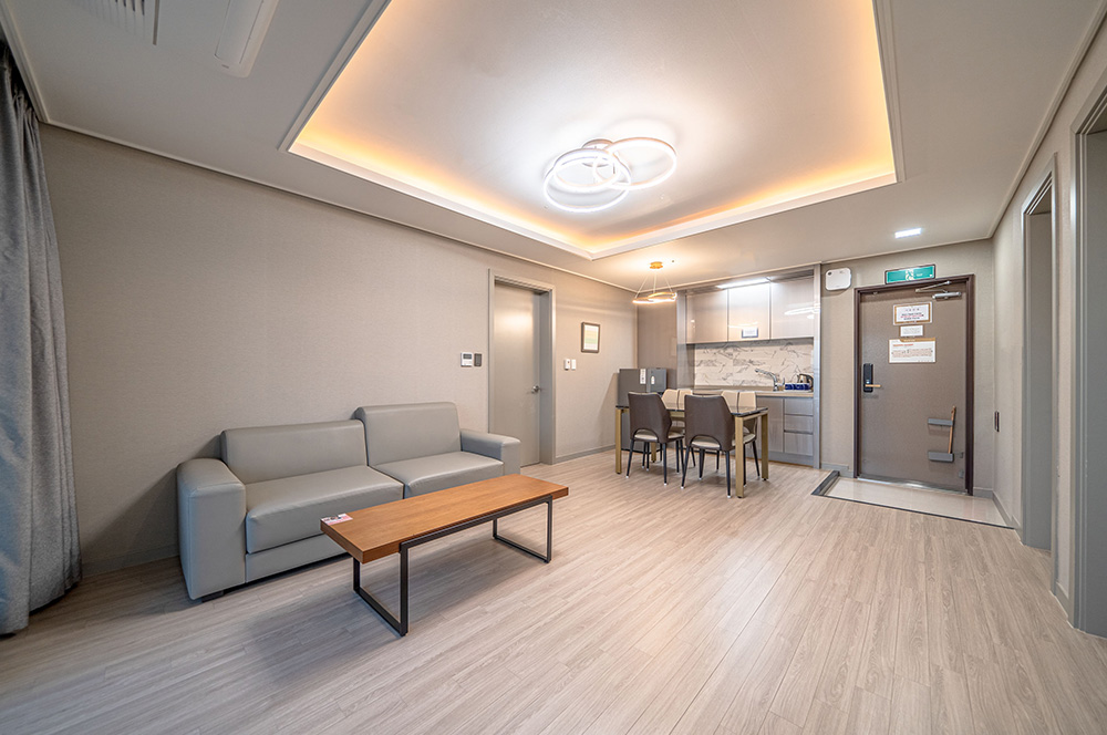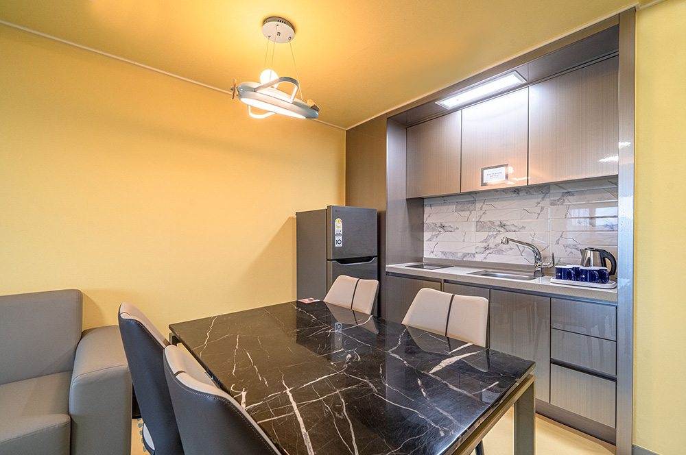 - 침실 & 거실: TV, 개별 냉난방, 전화기, 4인 소파, 쇼파 테이블, 4인 식탁세트, 옷장, 옷걸이, 화장대, 헤어드라이기, 빗, 전기포트, 냉장고, 컵, 볼펜